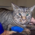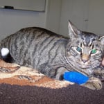 Der Kater lag auf einem Behandlungstisch und hing mit verbundener Pfote am Tropf. Die Schwestern sagten uns, dass er wahrscheinlich von einem Auto einen Schwinderling bekommen hat. Dadurch schwoll sein Gehirn an und er konnte sich deshalb auch nicht mehr bewegen. Im Moment hätte er ganz starke Kopf- schmerzen, deshalb würde er auch andauernd miauen.